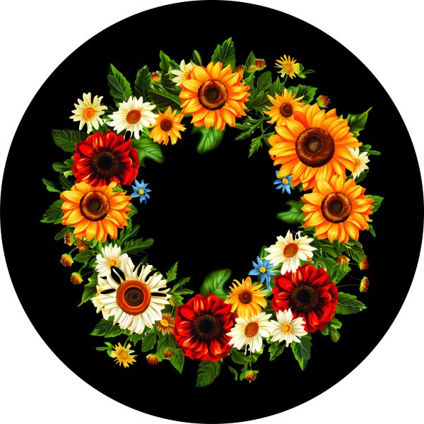 Enhance your vehicle's appearance with the Floral Wreath w/ Sunflowers Tire Cover!