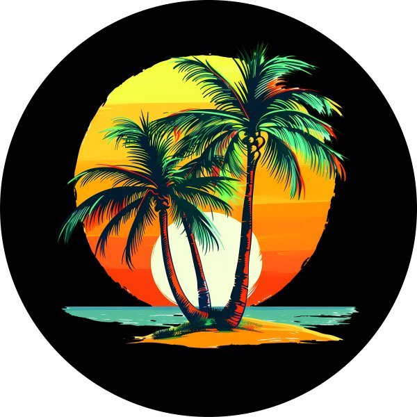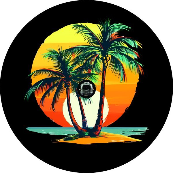 Enhance your vehicle's appearance with the Tropical Palm Trees w/ Sunset Spare Tire Cover!
